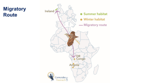 Like the famous advertisement on TV – “Tá said ag teacht”. By early April the corncrakes are on their way home from the south-west Africa region mainly the DR of Congo. They fly 6,500km across jungle, desert, mountains and oceans. They will return to within 5-10km of where they were born.