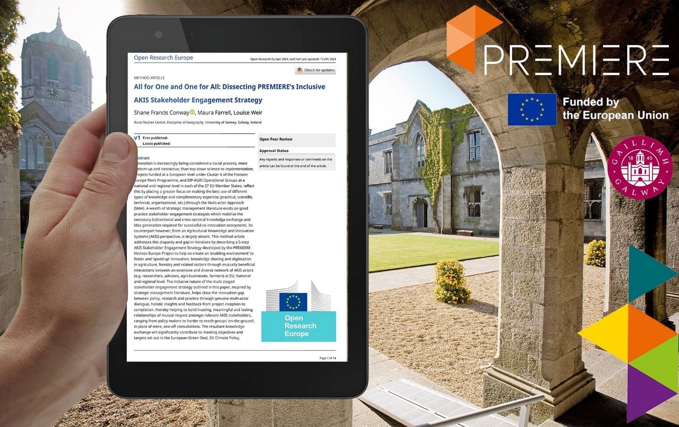 More information on PREMIERE’s 5-Step Stakeholder Engagement Strategy can be found in a paper published on this strategy in Open Research Europe, a scholarly publishing platform available to Horizon 2020 and Horizon Europe beneficiaries. (Citation: Conway, S.F., Farrell, M. and Weir, L. (2024) All for One and One for All: Dissecting PREMIERE’s Inclusive AKIS Stakeholder Engagement Strategy, Open Research Europe, 4:27, see: https://doi.org/10.12688/openreseurope.16954.1).