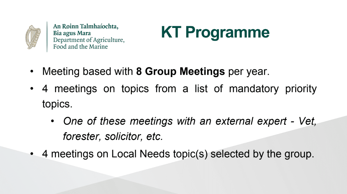 A Knowledge Transfer (KT) Programme intervention is included in Ireland’s CAP Strategic Plan 2023-2027. Perspective facilitators who submitted applications by the closing date in September are now undertaking the process of assembling their farming groups and workshop plans. These plans need to be submitted to DAFM by November 10th and must include the participating farmers details and the clearly defined local need(s) they wish to address.