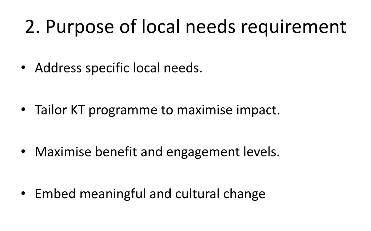 A key focus area for the new K.T programme is the inclusion and spotlight on Local Needs. Of the eight workshops held by facilitators, four must be based on Local Needs and because of this, the regional webinars focused on providing substantial support, resources, and guidance on how best to approach and deliver a Local Needs programme.