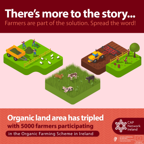 CAP Network Ireland champions sustainable agriculture and rural innovation, and it aims to nurture connections, spark innovation, and present funding opportunities within Ireland’s CAP Strategic Plan (CSP). It supports a variety of schemes that aim to improve the health of our natural environment and support sustainable rural development, under which significant advances have been made by the farmers involved. For example, organic land area has tripled in recent years with over 5,000 farmers now taking part in the Organic Farming Scheme. The sector has achieved a 4.6 % reduction in greenhouse gas emissions between 2022 and 2023. Other positive figures emerge from ongoing schemes such as the Eco-Scheme and ACRES (the Agri-Climate Rural Environment Scheme).